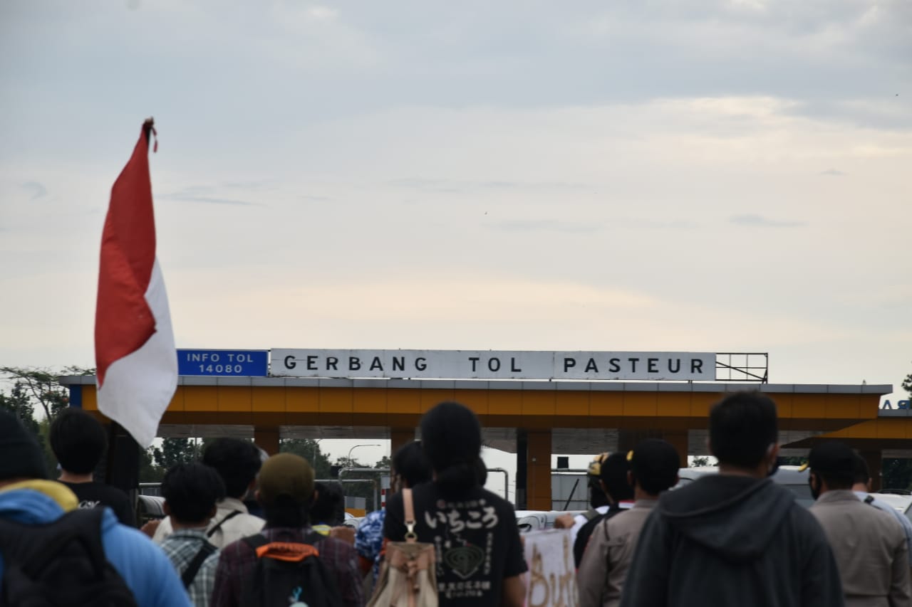 BANDUNG — Kelompok Mahasiswa Indonesia Menggugat (MIM) menggelar unjuk rasa di gerbang keluar Tol Pasteur sehingga menyebabkan kemacetan menuju Jembatan Layang Pasopati, Jumat (23/10/2020).