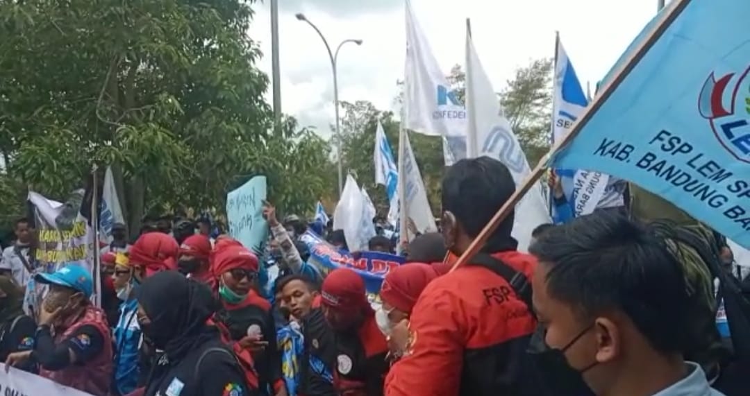 Kab. Bandung Barat,– Ratusan massa buruh di Kabupaten Bandung Barat (KBB) kembali melakukan aksi demo ke Kantor Pemkab. Mereka menuntut kenaikan Upah Minimum Kabupaten (UMK) sesuai kebutuhan hidup layak.
