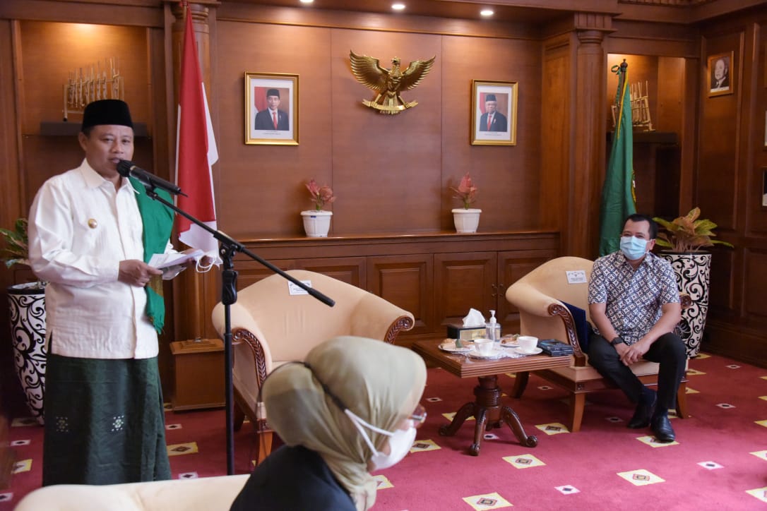 BANDUNG – Wakil Gubernur (Wagub) Jawa Barat (Jabar) Uu Ruzhanul Ulum menerima bantuan penanganan Covid-19 berupa masker medis 10.000 unit dari ST Engineering Pte. Ltd secara simbolis di Ruang Lokantara Gedung Sate, Kota Bandung, Senin (22/11/2021).