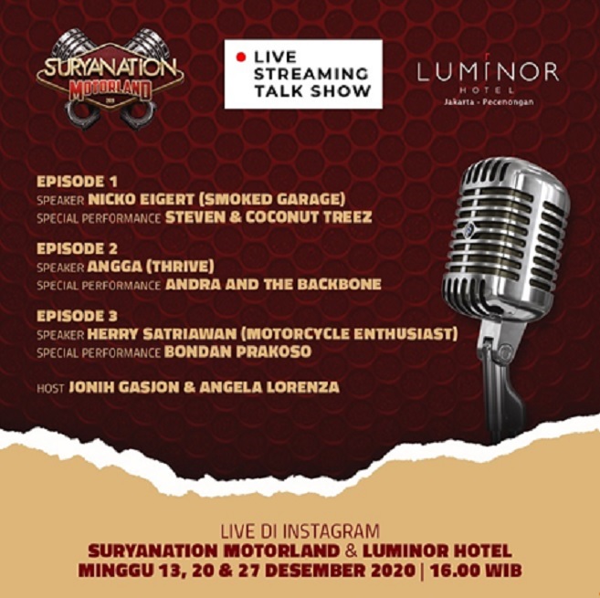 Selanjutnya, Luminor telah mengadakan Live Streaming Talk Show episode 1 pada hari Minggu, 13 Desember 2020 lalu. Acara ini tayang exclusive hanya di 2 akun instagram yaitu @suryanation_motorland dan @luminorhotelpecenongan. Dihadiri oleh narasumber Nicko Eigert dari Smoked Garage sebagai sosok pembuat Iconic Bike Suryanation Motorland tahun 2019 dan special performance dibawakan oleh musisi reggae Indonesia yang paling terkenal, Steven dan Coconut Treez.