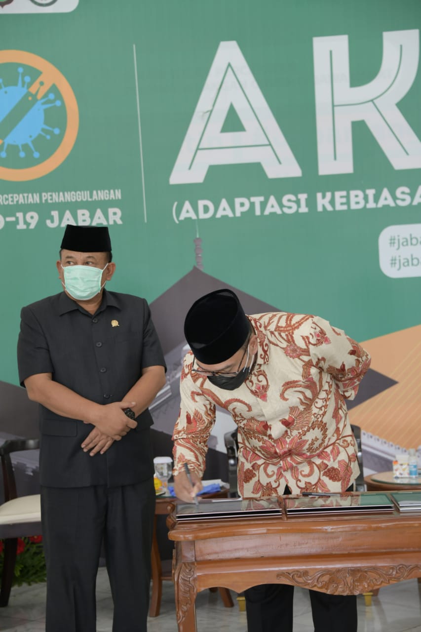BANDUNG, — Gubernur Jawa Barat (Jabar) Ridwan Kamil menandatangani Perjanjian Pinjaman Daerah Tahun 2020 antara Pemerintah Daerah (Pemda) Provinsi Jabar dan PT Sarana Multi Infrastruktur (Persero) melalui videoconference dari Gedung Pakuan, Kota Bandung, Kamis (24/9/2020).