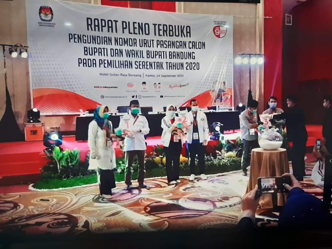 KAB.BANDUNG I KPU Kabupaten Bandung telah menetapkan nomor urut pasangan calon Bupati/Wakil Bupati. Penetapan berdasarkan pengundian yang digelar di Hotel Sutan Raja Soreang, Kamis (24/9/20).