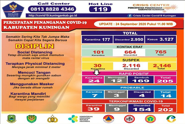 Juru bicara Crisis Centre Covid-19 Agus Mauludin, SE membenarkan bahwa, Kab Kuningan masih zona orange dan di-khawatirkan sebaran Covid-19 semakin merebak ketika dikonfirmasi melalui selulernya Kamis (24/09/2020).