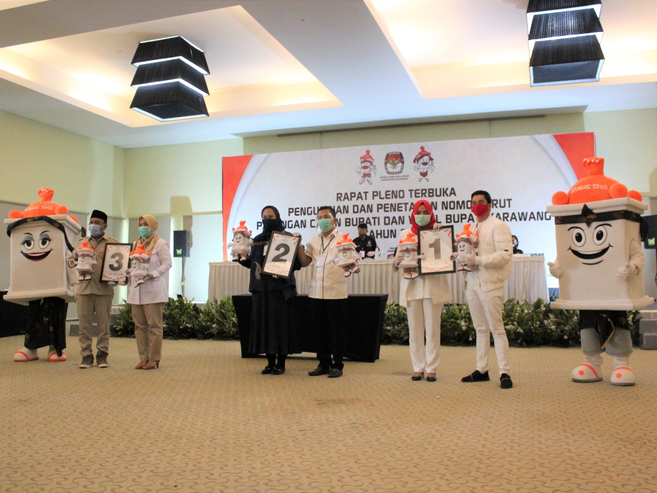 Kegiatan pengundian nomor urut pasangan calon Bupati dan Wakil Bupati Karawang digelar dengan menerapkan protokol kesehatan yang ketat sesuai dengan Peraturan Komisi Pemilihan Umum (PKPU) Nomor 13 tahun 2020.