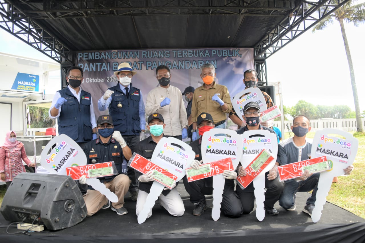 PANGANDARAN ,–Gubernur Jawa Barat (Jabar) Ridwan Kamil menyerahkan sebelas  unit Mobil Aspirasi Kampung Juara (Maskara)  bersamaan dengan kegiatan peletakkan batu pertama pembangunan ruang terbuka publik di Pantai Barat Pangandaran, Kabupaten Pangandaran, Jumat (23/10/2020).