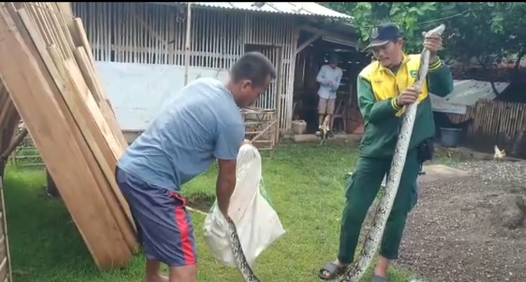 KAB. CIANJUR, — Satu ekor ular piton besar degan panjang 4 meter yang kerap memangsa ternak peliharaan milik warga di Kampung Cinangsi RT 03/10 Desa Kertamukti Kecamatan Haurwangi Kabupaten Cianjur Jawa Barat berhasil ditangkap warga pada Jumat (24/02/23).