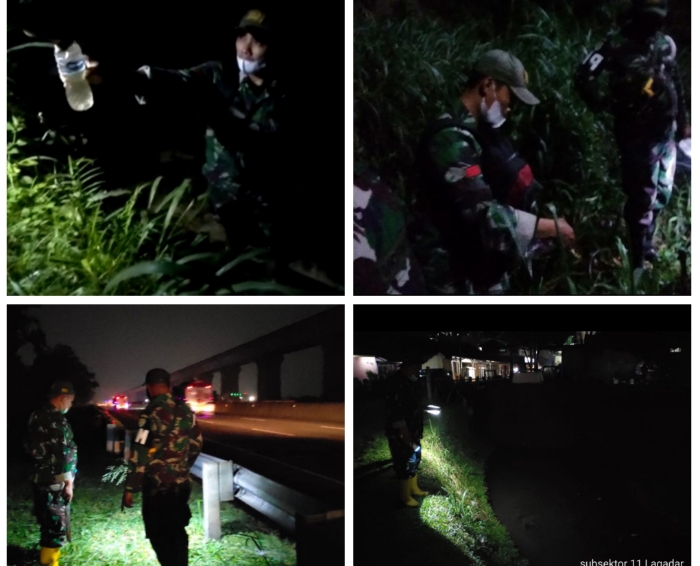 Satgas rutin berpatroli malam dengan menelusuri aliran sungai di wilayah Desa Lagadar sambil mengecek saluran pembuangan akhir (outfall).