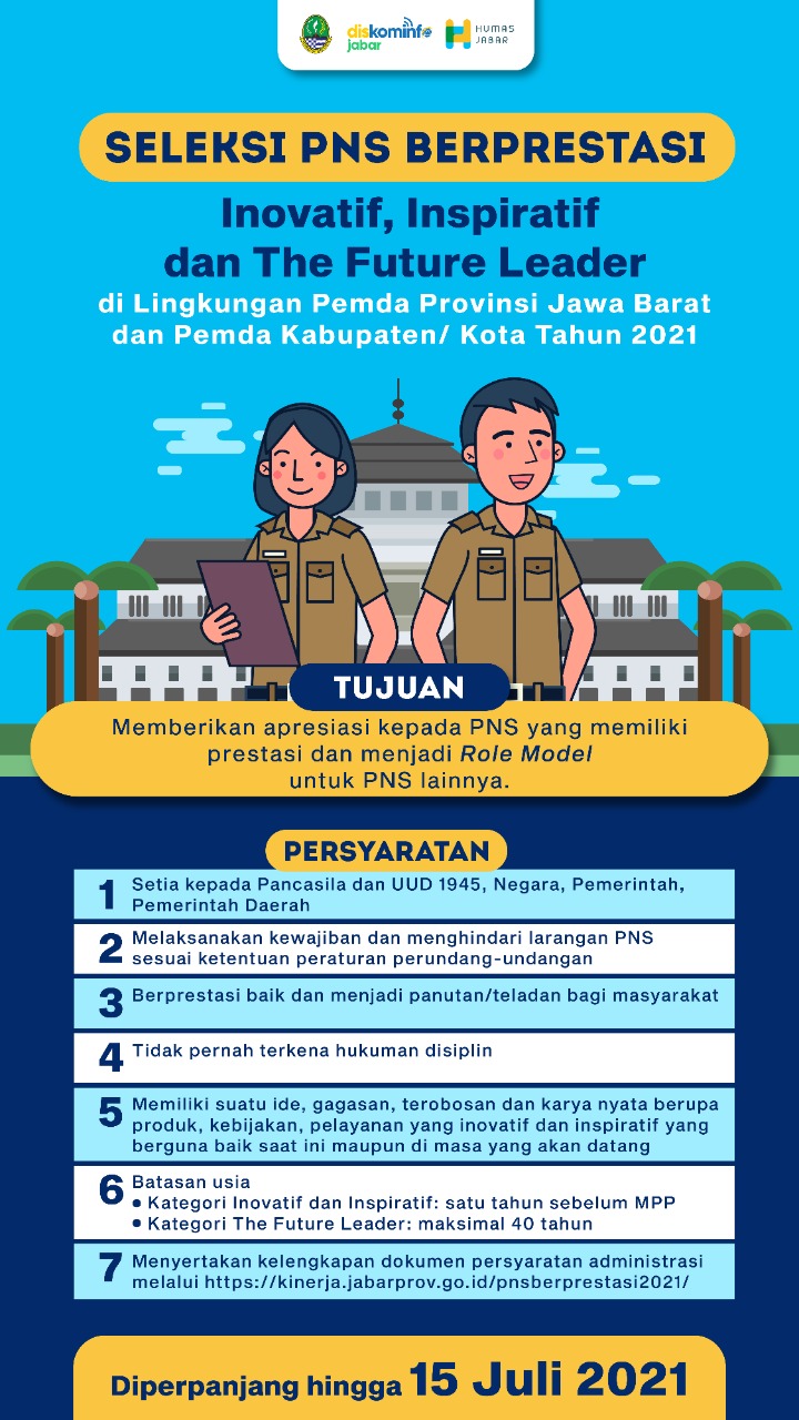 PNS yang memenuhi persyaratan administrasi dapat mengunggah kelengkapan dokumen melalui link https://kinerja.jabarprov.go.id/pnsberprestasi2021/. Pengajuan disampaikan selambat-lambatnya sampai 15 Juli 2021.
