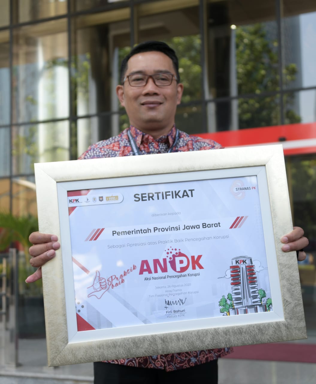 BANDUNG,–Pemerintah Daerah (Pemda) Provinsi Jawa Barat (Jabar) mendapat Apresiasi Praktik Baik dalam Aksi Nasional Pencegahan Korupsi (ANPK) dari Komisi Pemberantasan Korupsi (KPK). Sertifikat apresiasi tersebut diterima langsung oleh Gubernur Jabar Ridwan Kamil di Gedung KPK, Jakarta, Rabu (26/8/2020).