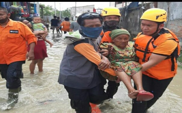 Di Kampung Pisangan RT14/07, Desa Satria Mekar, Kecamatan Tambun Utara, Petugas BPBD mengevakuasi sejumlah manula atau lanjut usia yang terkepung Banjir dan dijemput dari rumahnya menggunakan perahu karet bahkan ada yang digendong oleh petugas BPBD.