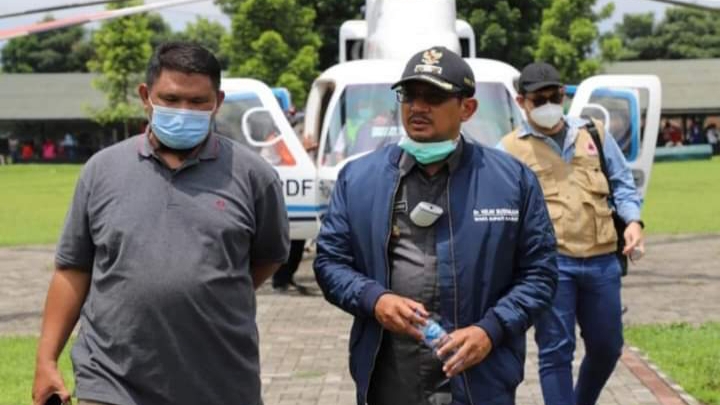 GARUT– Wakil Bupati Garut Helmi.Budiman bersama Danrem 062 Tarumanagara, Kolonel Inf. Muhamad Muchidin, dan Dandim 0611 Garut, Letkol CZI Deni Iskandar, dan Kadivreg Perhutani Jabar, Dicky Iwana Radi, memantau dari udara kondisi lahan pasca Banjir bandang dan longsor 11 Oktober kemarin menggunakan dua pesawat helicopter.