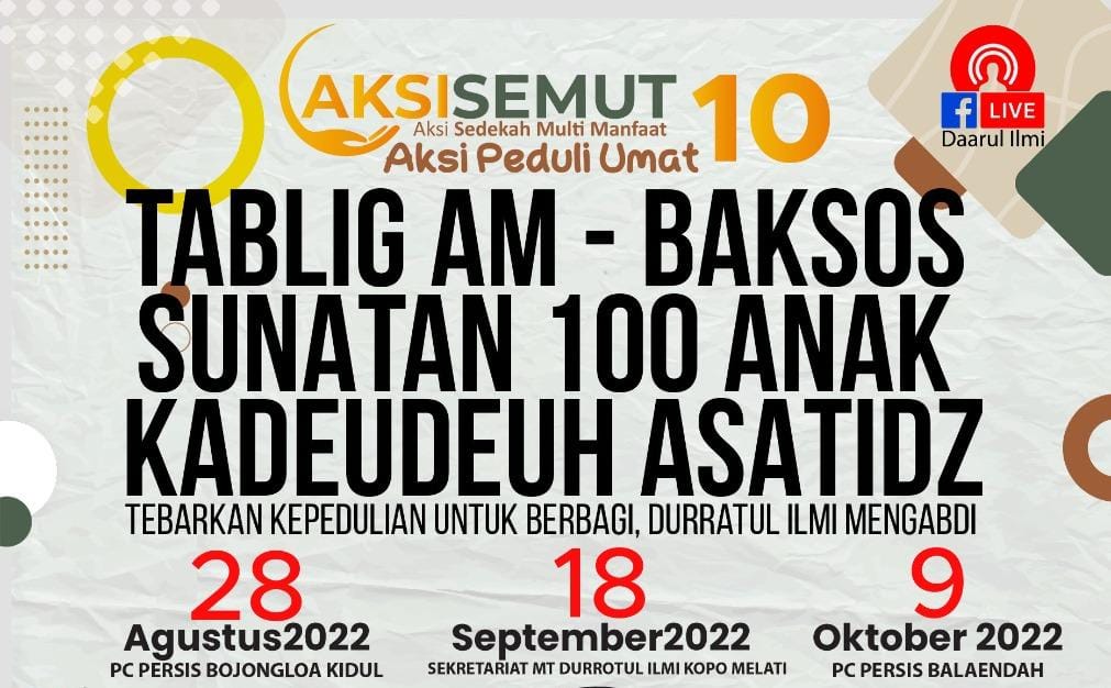 Kegiatan baksos ini merupakan agenda rutin setiap tahunnya yang dilakukan Yayasan Durratul Ilmi, namun 2 tahun belakangan kegiatan baksos mengalami vakum akibat pandemi Covid-19 yang melanda di hamper semua negara. Akibat kevakuman itu, maka kegiatan baksos tahun ini rencananya akan digelar secara roadshow di tiga lokasi berbeda, diantaranya di Gedung Dakwah Terpadu (GDT) Pimpinan Cabang (PC) Persis Bojongloa Kidul Cibaduyut, Sekretariat Durrotul Ilmi di kawasan Kopo Melati serta di PC Persis Baleendah.