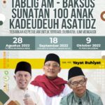 “Insya Alloh sesuai jadwal, kita akan laksanakan baksos pada hari besok (Minggu 28 Agustus 2022. Red), dengan segala persiapan yang sudah kami susun sebelumnya. Kemudian Tabligh Am atau Tablig Akbar sendiri kami mengundang Ustadz KH. Ucu Najmudin, M.Pd yang akan mengisi sebagai penceramah. Baksos tahun ini kami akui adalah kegiatan baksos teristimewa karena dilakukan secara marathon dengan tiga lokasi berbeda,” tuturnya.
