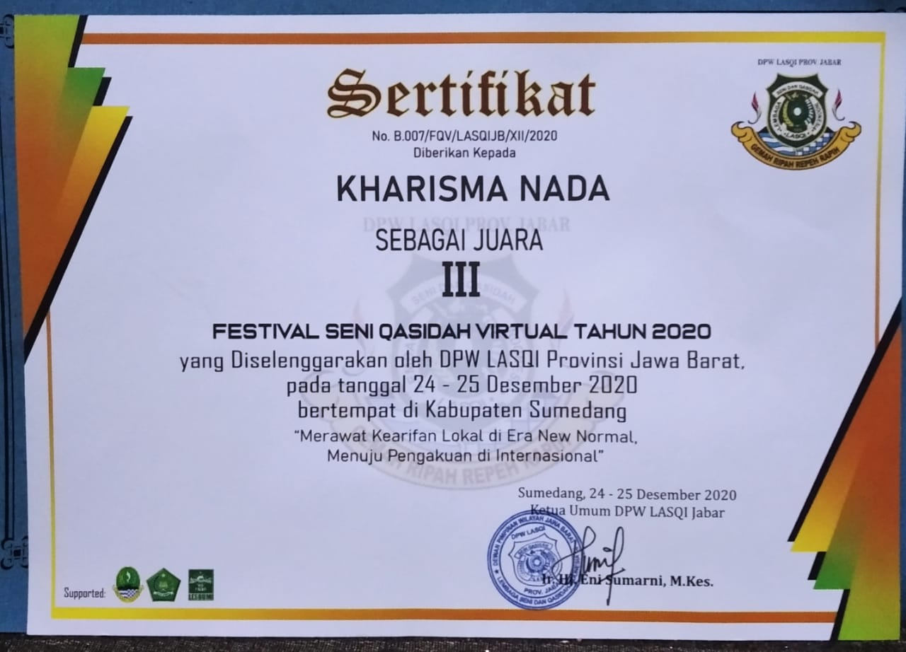 “Alhamdulilah, kita mendapatkan juara. Walaupun persiapan dalam mengikuti perlombaan tersebut sangat mendadak, saya sendiri sangat bangga kepada Kharisma Nada yang berhasil membawa pulang piala,”ujar Nining saat dikonfirmasi melalui telepon, Minggu (27/12/2020).