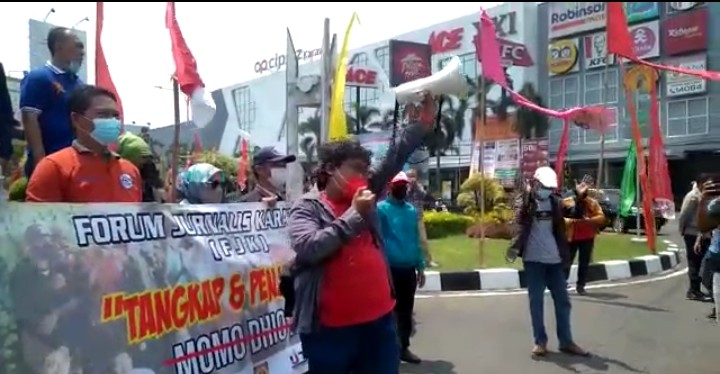 Ratusan insan pers yang tergabung dalam Forum Jurnalis Karawang (FJK) berkumpul di Bunderan Mal Ramayana Karawang, Selasa (28/9/2021).