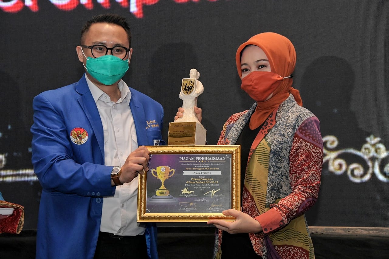 Ketua TP-PKK Provinsi Jawa Barat (Jabar) Atalia Praratya Ridwan Kamil menerima penghargaan “Pejuang Perempuan di Masa Pandemi COVID-19” pada malam puncak Women Expo KNPI Jabar 2020 di Hotel Aston Sentul, Kabupaten Bogor, Rabu (28/10/2020). (Foto: Pipin/Humas Jabar)