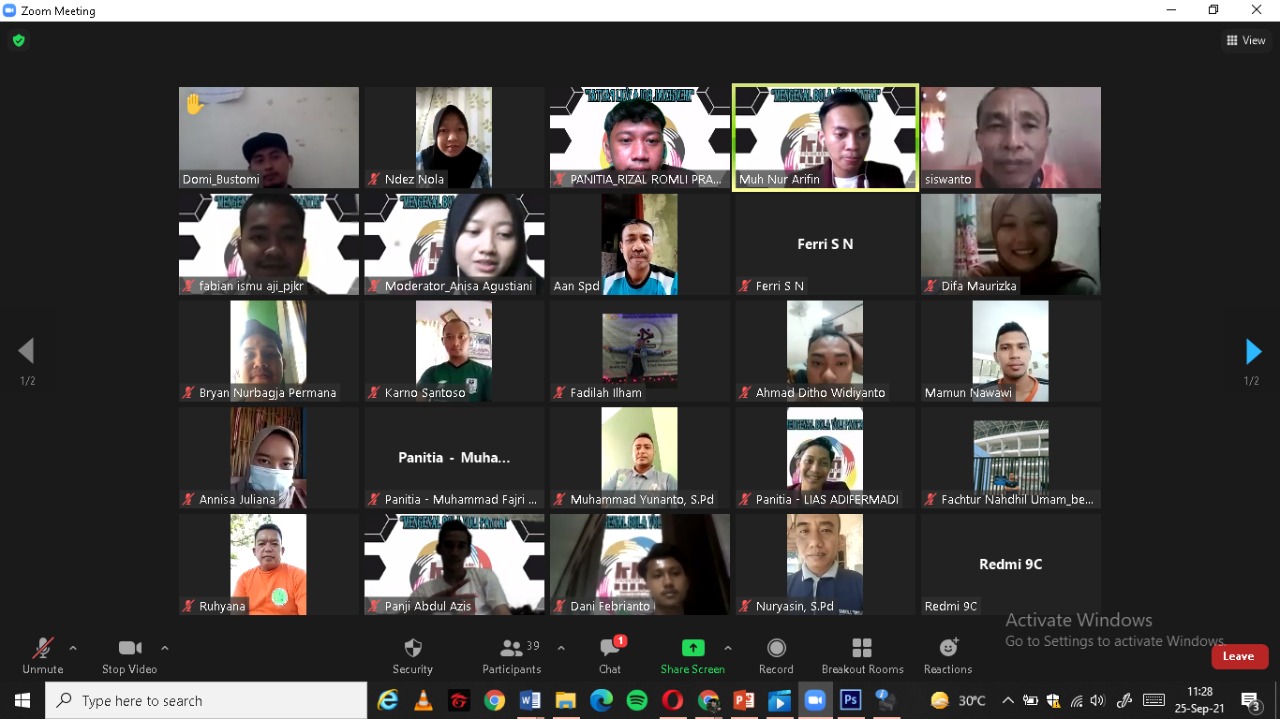 Webinar dilaksanakan pada tanggal 25 September 2021 dengan pemateri tidak lain Dosen Pembimbing Lapangan (DPL) Bapak Siswanto S.Pd., M.Pd yang juga merupakan Atlit voli pantai dan juga Pelatih voli pantai khususnya di Kabupaten Indramayu. Webinar ini dihadiri 120 peserta melalui ZOOM premium. Peserta sangat antusias dalam mengikut Webinar ini.