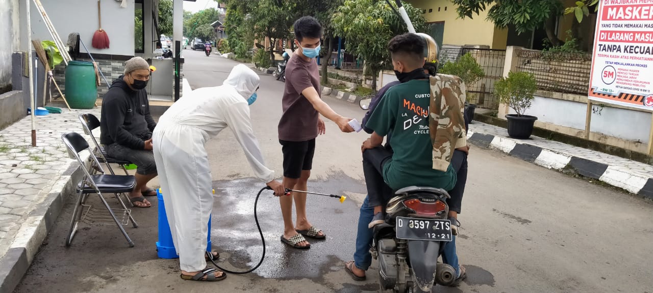 Warga yang harus beraktivitas ke luar rumah terlebih dahulu disemprot disinfektan sebelum masuk kembali ke dalam komplek perumahan.