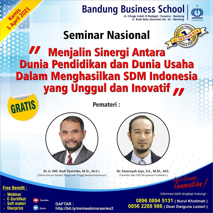 Demikian diungkapkan Ketua Pelaksana, Jujun Junaedi, SE di Bandung, Rabu (31/3/2021). “Insya Allah, webinar yang akan digelar sangat menarik dan tentunya akan sangat bermanfaat bagi para mahasiswa, praktisi pendidikan, praktisi usaha dan masyarakat umum. Tema yang diusung adalah Menjalin Sinergi Antara Dunia Pendidikan dan Dunia Usaha dalam Menghasilkan SDM Indonesia yang Unggul dan Inovatif,” ujarnya.