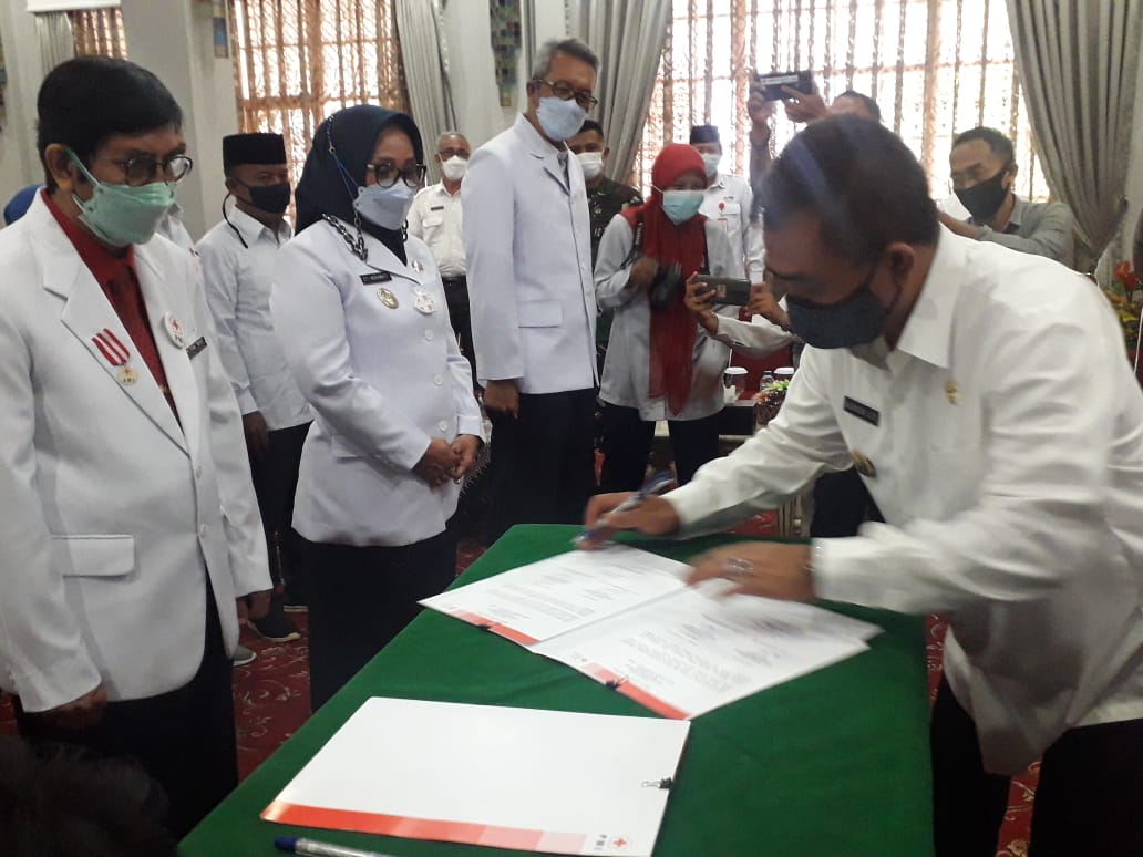 CIREBON, (cirebonbagus.id).-Wali Kota Cirebon Nashrudin Azis menyaksikan pengukuhan Pengurus dan Dewan Kehormatan PMI Kota Cirebon periode 2021-2026 di Ruang Adipura Kencana Balai Kota Cirebon.