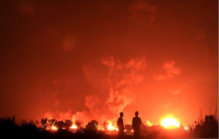 Beberapa jam kemudian warga mendengar dentuman yang sangat keras disertai api yang membakar tangki kilang.