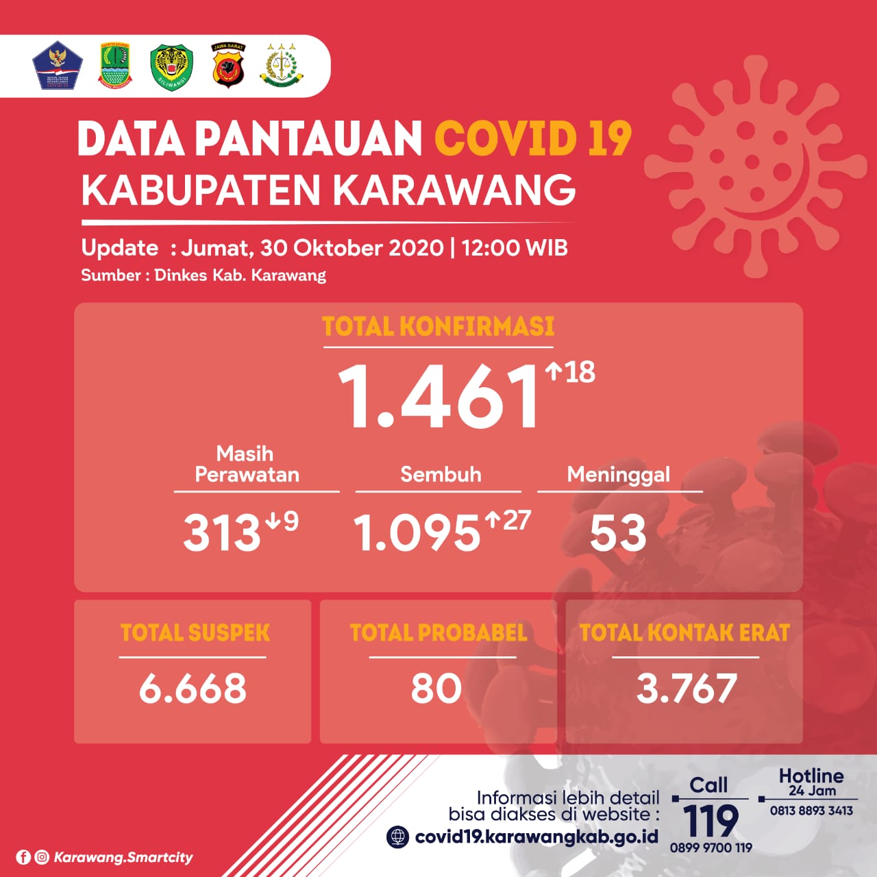 Data yang telah dihimpun Satgas, hingga Jumat 30 Oktober 2020, total warga Karawang yang terkonfirmasi virus corona berjumlah 1.461orang, dengan rincian 313 orang masih dalam perawatan, 1.095 orang sudah dinyatakan sembuh dan 53 orang meninggal dunia.