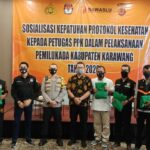 KARAWANG- Polres Karawang menggelar kegiatan sosialisasi kepatuhan protokol kesehatan kepada petugas Panitia Pemilihan Kecamatan (PPK) se-Kabupaten Karawang dalam pelaksanaan pemilukada Tahun 2020,