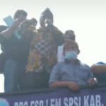 KARAWANG- Aksi demo puluhan ribu buruh yang menolak Undang-undang Omnibus Law diwarnai orasi anggota DPRD dari Fraksi Partai Keadilan Sejahtera (F-PKS) Kabupaten