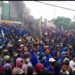 KARAWANG- Kantor Pemerintah Kabupaten Karawang dikepung ribuan demonstran yang banyak berasal mahasiswa berbagai kampus di Karawang bersama buruh dan pengemudi Ojek Online,