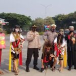 BEKASI- Untuk mendapat atensi lebih dari warga, petugas Polsek Cikarang Pusat sengaja berbusana adat saat membagikan masker di perempatan lampu merah Kota