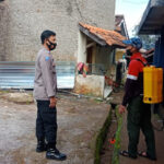 PACET – Bhabinkamtibmas Ds Mekarjaya Bripka Dani Setia Maulana Bersama warga melaksanakan sterilisasi dengan menyemprotkan cairan disinfektan di pemukiman warga di Kp