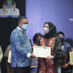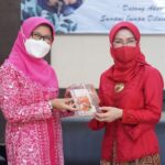 KAB. BEKASI — Tim Penggerak (TP) PKK bersama Dharma Wanita Persatuan (DWP) Kabupaten Bekasi, menyerahkan tali kadedeuh kepada Ria Dani Ramdan, selaku