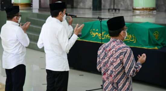 Jakarta – Presiden Joko Widodo bertakziah dan datang melayat ke tempat mendiang Mantan Hakim Agung Artidjo Alkostar disemayamkan di Masjid Ulil Albab,