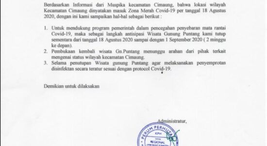 BANDUNG–Objek wisata Gunung Puntang, Kecamatan Cimaung, Kabupaten Bandung ditutup sementara. Penutupan dilakukan mulai 18 agustus sesuai dengan surat resmi dari Perhutani Bandung
