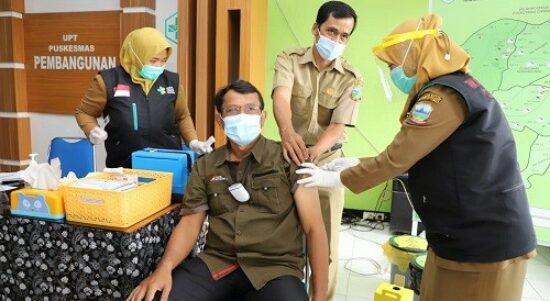 GARUT, Tarogong Kidul – Wakil Bupati Garut dr. Helmi Budiman menjalani vaksinasi Covid-19 tahap kedua di Puskesmas Pembangunan, Kecamatan Tarogong Kidul, Kabupaten